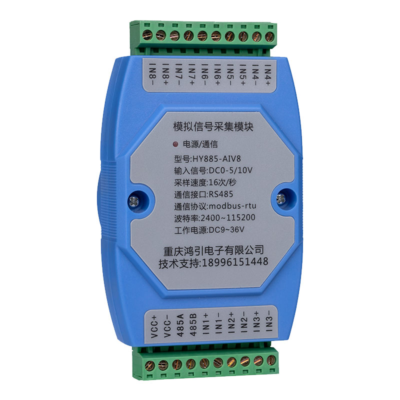 采用進(jìn)口16位模數(shù)轉(zhuǎn)換芯片,把8路DC0~5V(或10V)模擬信號(hào)轉(zhuǎn)換成數(shù)字信號(hào),通過RS485接口輸出,DC0~5V(或10V)輸入對(duì)應(yīng)的數(shù)字量為0-20000。DC0-5V(或10V)模擬信號(hào)輸入與工作電源、RS485之間隔離。RS485采用標(biāo)準(zhǔn)Modbus-rtu協(xié)議,可與各種組態(tài)軟件、PLC、觸摸屏聯(lián)網(wǎng)。出廠預(yù)設(shè)RS485通信參數(shù):模塊地址1,波特率9600,8個(gè)數(shù)據(jù)位,無校驗(yàn)位,1位停止位,用戶通過上位機(jī)參數(shù)設(shè)置軟件修改通信參數(shù)。