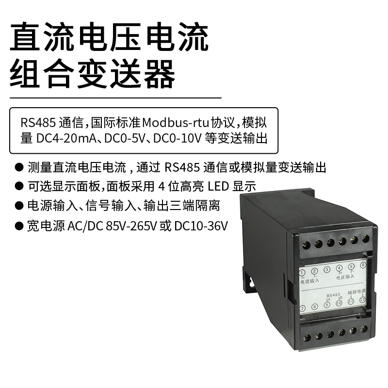 HY194-BS5U(HY194-BS5I)直流電壓(電流)變送器,是一種將直流電壓(電流)信號隔離轉(zhuǎn)換成線性直流模擬信號輸出或RS485數(shù)字通信接口輸出。模擬量輸出最多可選2路輸出,2路模擬量輸出之間互相隔離,模擬量可選:DC0~20mA、DC4~20mA、DC0~5V、DC1~5V、DC0~10V等變送輸出。RS-485數(shù)字通訊接口,采用國際標(biāo)準(zhǔn)MODBUS-RTU通訊協(xié)議,可與各種PLC、HMI、組態(tài)軟件實(shí)現(xiàn)組網(wǎng);可選顯示面板,面板采用4位高亮LED 顯示,并帶有3個(gè)按鍵用來進(jìn)行參數(shù)設(shè)置。