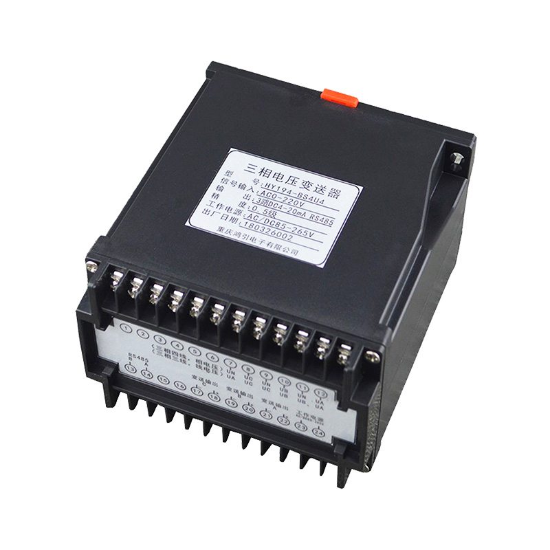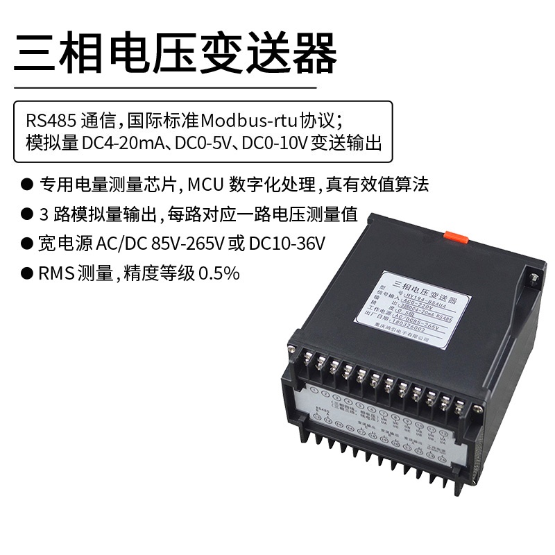 三相電壓變送器,通過專用電量芯片采樣,CPU 數(shù)字化處理,真有效值算法,高精度的測量三相電壓,隔離轉(zhuǎn)換成線性直流標(biāo)準(zhǔn)模擬信號輸出或RS485數(shù)字通信接口輸出。模擬量可選:DC0~20mA、DC4~20mA、DC0~5V、DC1~5V、DC0~10V等變送輸出;RS485數(shù)字通信接口,采用國際標(biāo)準(zhǔn)Modbus-rtu通信協(xié)議,可與各種PLC、HMI、組態(tài)軟件實現(xiàn)組網(wǎng)。