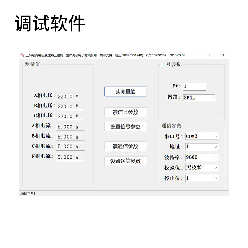 通過上位機(jī)調(diào)試軟件,可以讀出三相電壓測量值;可以設(shè)置電壓變比,接線方式;可以設(shè)置電壓變送器的通信地址,波特率,數(shù)據(jù)格式等。上位機(jī)調(diào)試軟件界面: