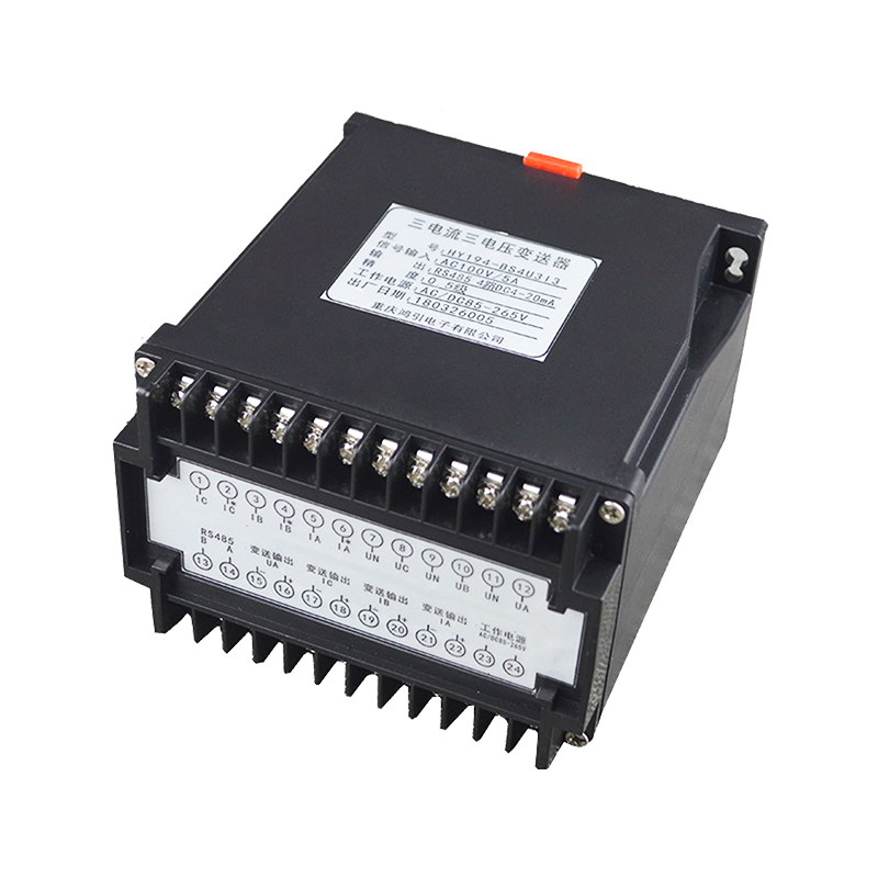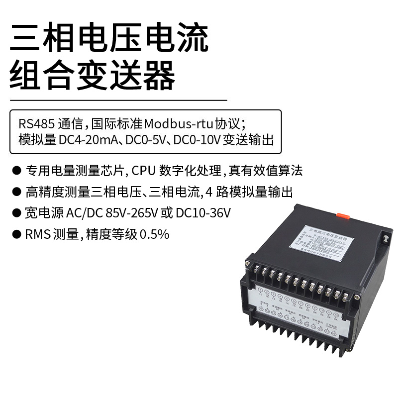 三相電壓電流組合變送器,通過專用電量芯片采樣,CPU 數(shù)字化處理,真有效值算法,高精度的測量三相電壓,三相電流,隔離轉(zhuǎn)換成線性直流標(biāo)準(zhǔn)模擬信號(hào)輸出或RS485數(shù)字通信接口輸出。模擬量可選:DC0~20mA、DC4~20mA、DC0~5V、DC1~5V、DC0~10V等變送輸出;RS485數(shù)字通信接口,采用國際標(biāo)準(zhǔn)Modbus-rtu通信協(xié)議,可與各種PLC、HMI、組態(tài)軟件實(shí)現(xiàn)組網(wǎng)。