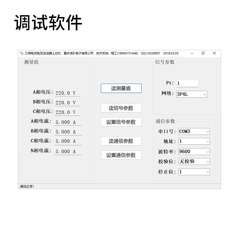 通過上位機(jī)調(diào)試軟件,可以讀出三相電壓電流測量值;可以設(shè)置電壓電流變比,接線方式;可以設(shè)置電壓變送器的通信地址,波特率,數(shù)據(jù)格式等。