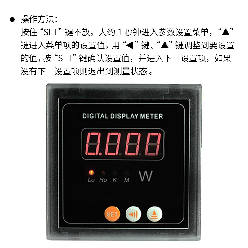 按住“SET”鍵不放,大約1秒鐘進入?yún)?shù)設(shè)置菜單,“▲”鍵進入菜單項的設(shè)置值,用“?”鍵、“▲”鍵調(diào)整到要設(shè)置的值,按“SET”鍵確認(rèn)設(shè)置值,并進入下一設(shè)置項,如果沒有下一設(shè)置項則退出到測量狀態(tài)。