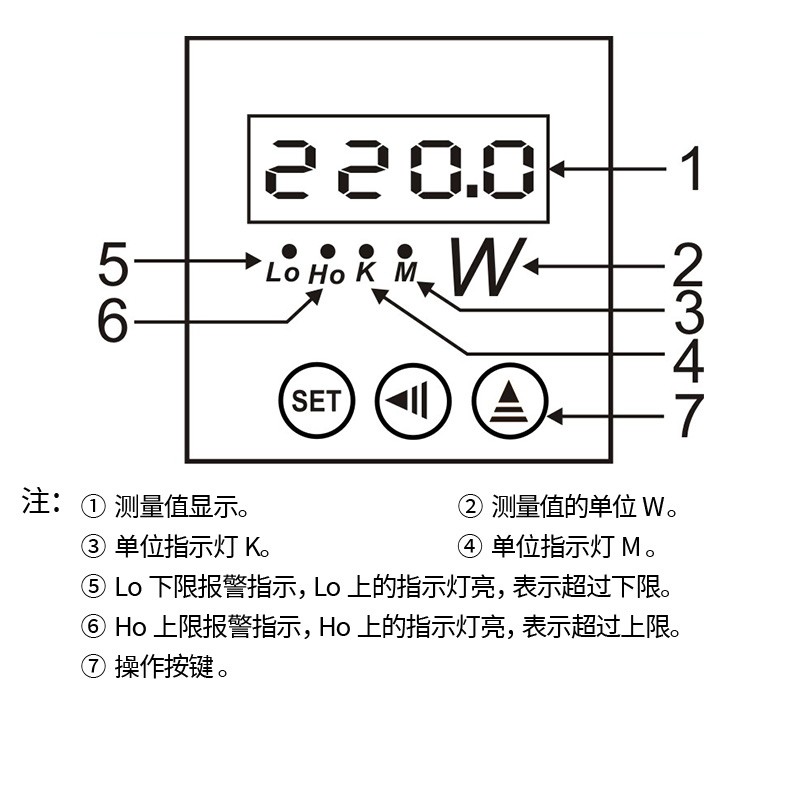 ⑤、Lo下限報警指示,Lo上的指示燈亮,表示超過下限 。
