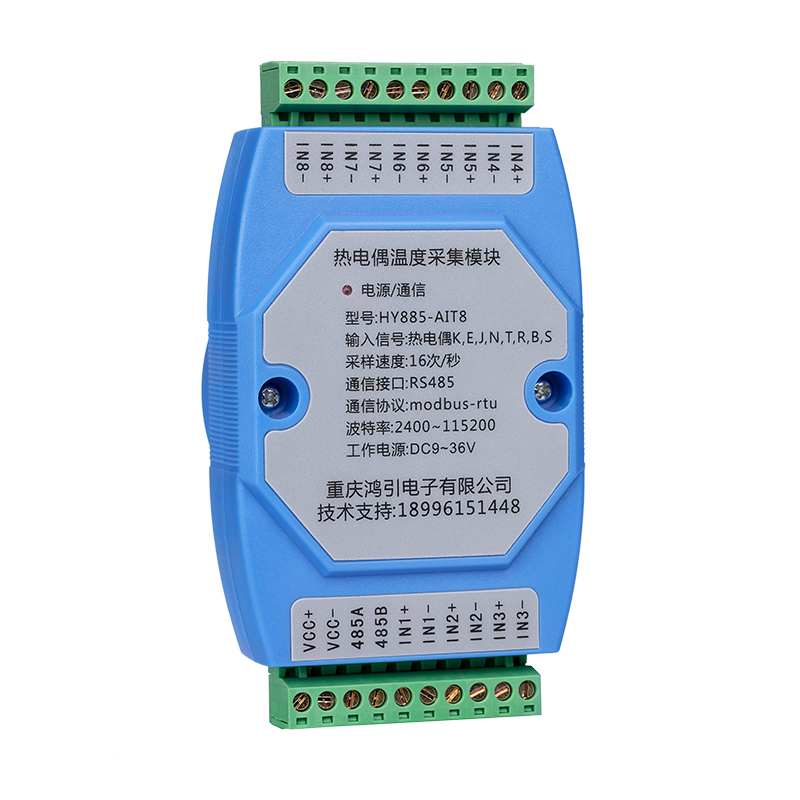 測(cè)量8路熱電偶溫度信號(hào),通過(guò)RS485接口輸出。熱電偶信號(hào)輸入與工作電源、RS485之間隔離。RS485通信采用標(biāo)準(zhǔn)modbus-rtu協(xié)議,可與各種組態(tài)軟件,PLC,觸摸屏聯(lián)網(wǎng)。出廠預(yù)設(shè)RS485通信參數(shù):模塊地址1,波特率9600,8個(gè)數(shù)據(jù)位,無(wú)校驗(yàn)位,1位停止位,用戶通過(guò)上位機(jī)參數(shù)設(shè)置軟件修改通信參數(shù)。